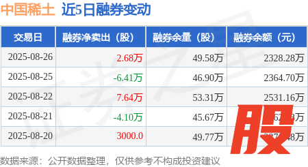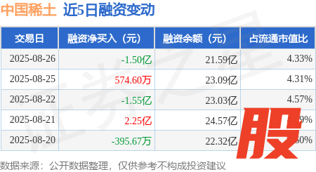 本站消息,8月26日,中国稀土(000831)融资买入3.57亿元,融资偿还5.06亿元,融资净卖出1.5亿元,融资余额21.59亿元。